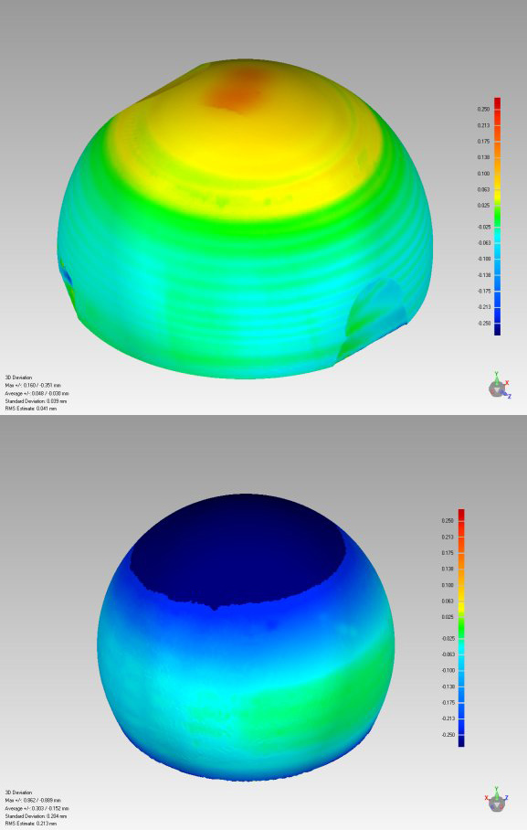 Alongside our experience with adapting standard wear test methods for DM hip replacements, we have addressed the challenges involved in dual mobility testing and wear analysis procedures, including: component disassembly and re-installment at test intervals for gravimetric analysis, as well as post-test dimensional analysis to assess wear scars, surface morphology, and define minimum polyethylene thickness (Figure 4). Our engineers routinely perform dimensional measurements using a high precision coordinate measuring machine (CMM) and a repeatable set-up.