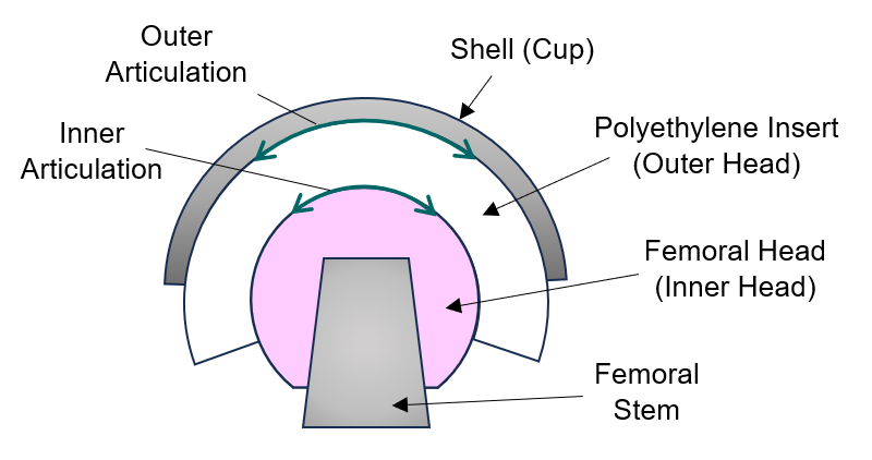 Dual mobility (DM) hip replacements were developed to improve stability and increase mobility in the hip joint by means of its unique dual articulating bearing design. In a dual mobility hip replacement, a fixed metal shell (cup) is implanted into the acetabulum, a femoral head is fixed onto the femoral stem, and a second larger head (polyethylene insert) articulates in between (Figure 1).